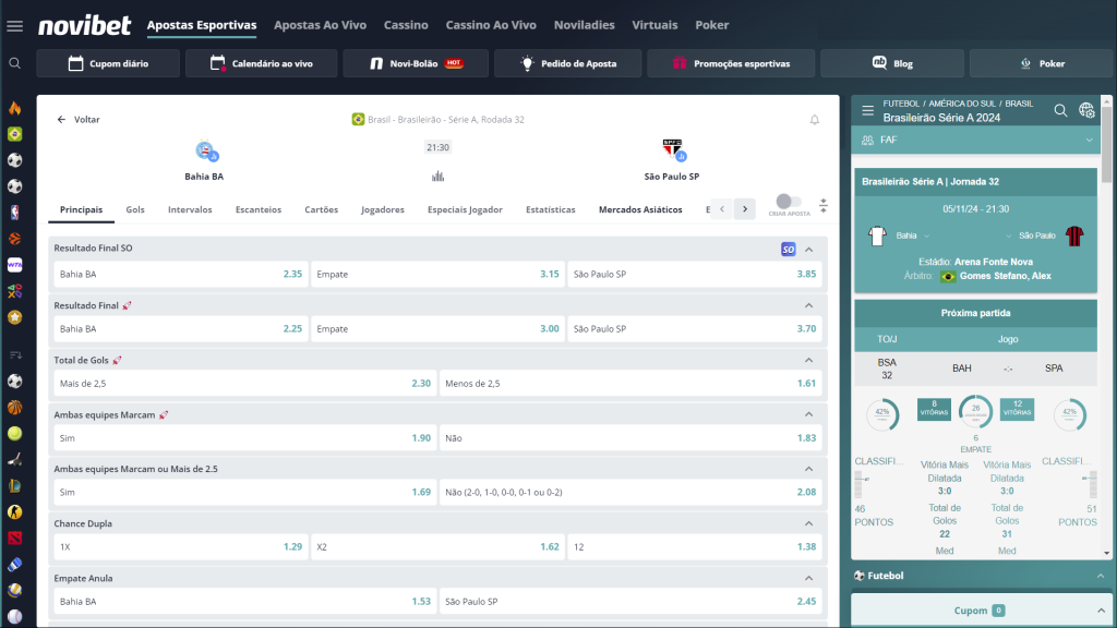 No menu principal da Novibet, localizado no canto esquerdo da tela, escolha uma modalidade esportiva, como Futebol, Basquete, Futebol Americano, etc.